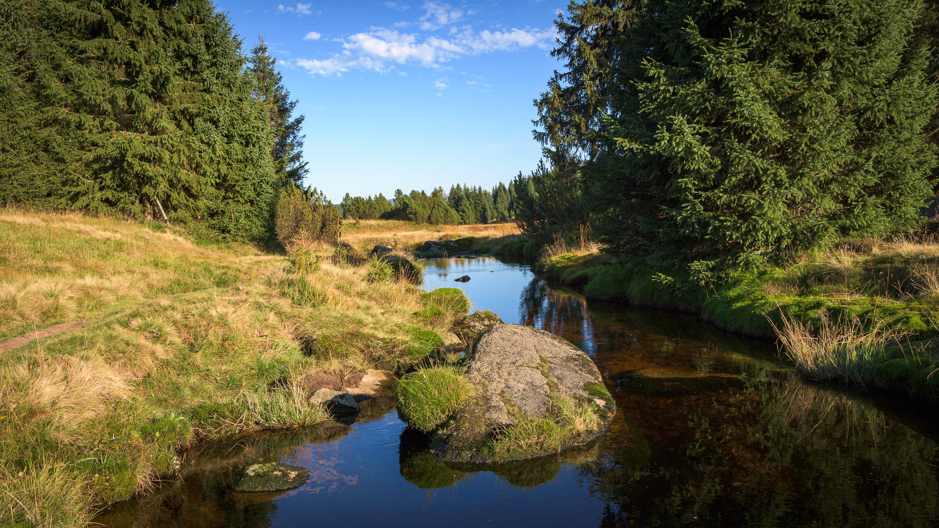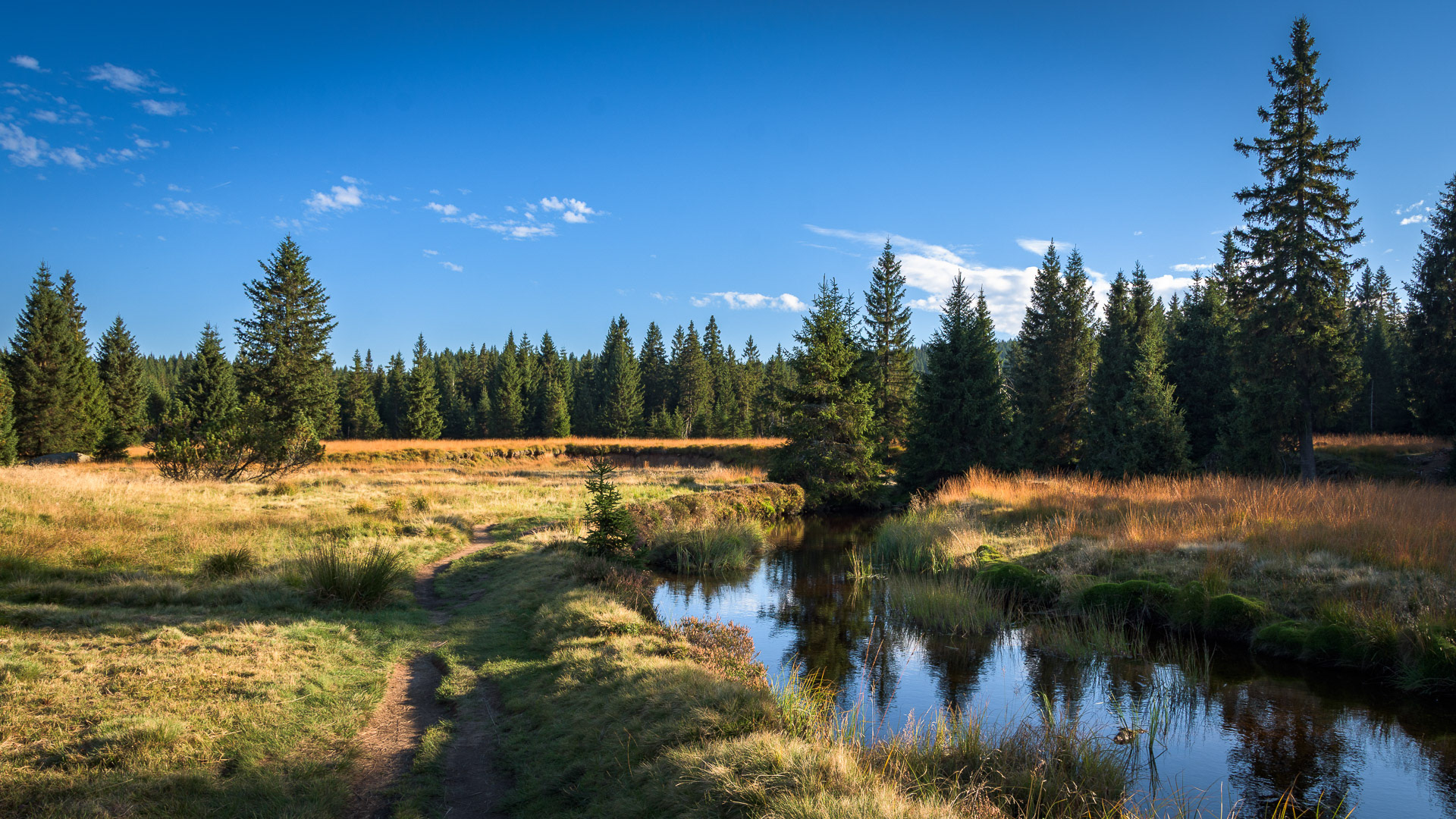 Ještě před Pešákovnou sejdeme ze silnice na naučnou stezku rašeliništěm Jizerky, která nás příjemnějším terénem dovede až do osady Jizerka.