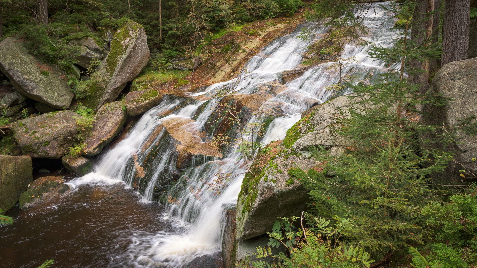 Pod Souší se napojíme na červenou turistickou značku vedoucí po toku říčky Černá Desná. Vody teče spousta, tak si po cestě můžeme vychutnat celou řadu vodopádů.