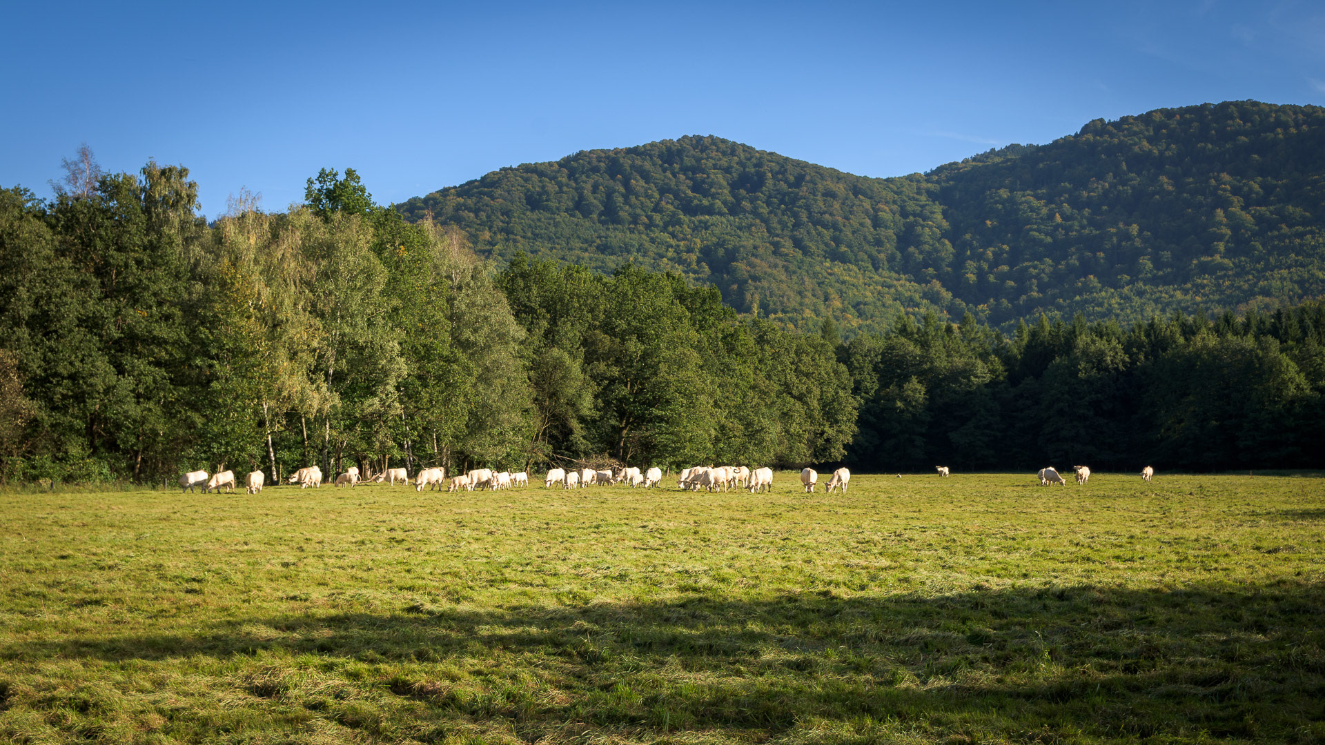 Cesta kolem pastvin je pohodlná a počasí nám přeje. Dlouhé stíny od zapadajícího slunce nám signalizují blížící se podvečer.